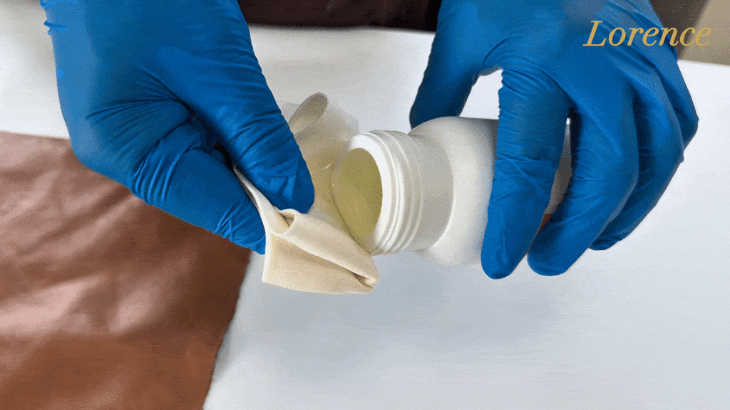使用皮革清潔劑以打圈方式輕柔去除表面油脂與灰塵,自然待幹,確保基底清潔,增強顏料附著力;